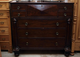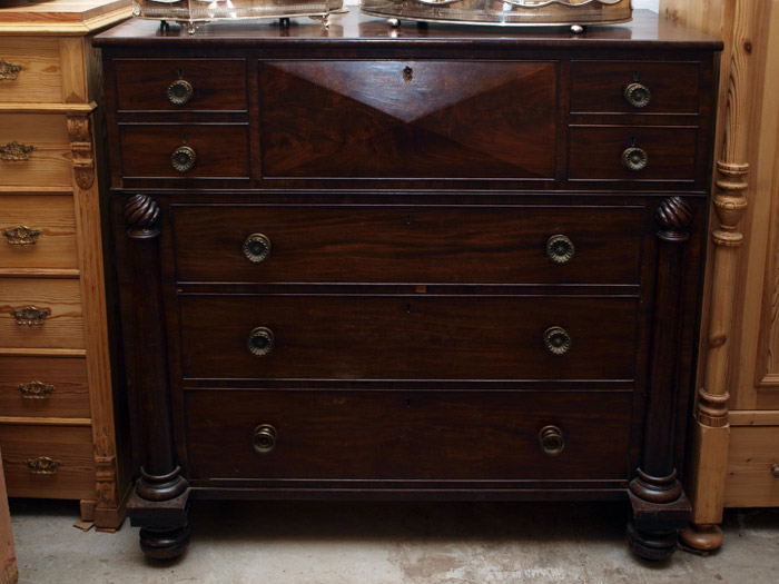Schottische Mahagoni-Kommode 3 große und 4 kleine Schubladen seitliche Säulen 120 x 123 x 57 cm HxBxT 1.280,- € (Artikelnummer K-0110)